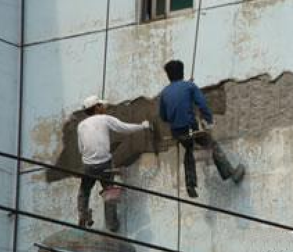 外墻瓷磚修補作業前工人佩帶防墜器、安全帶、安全繩等保護裝置,由多名工人配合作業將外墻進行修補。外墻瓷磚出現掉落后要及時進行修補,一是瓷磚繼續掉落容易砸傷路人,二是瓷磚掉落影響墻體整體美觀性,三是剛開始局部掉落,如果不及時修補到后期很可能是大面積掉落,這時要想修補會比較麻煩。